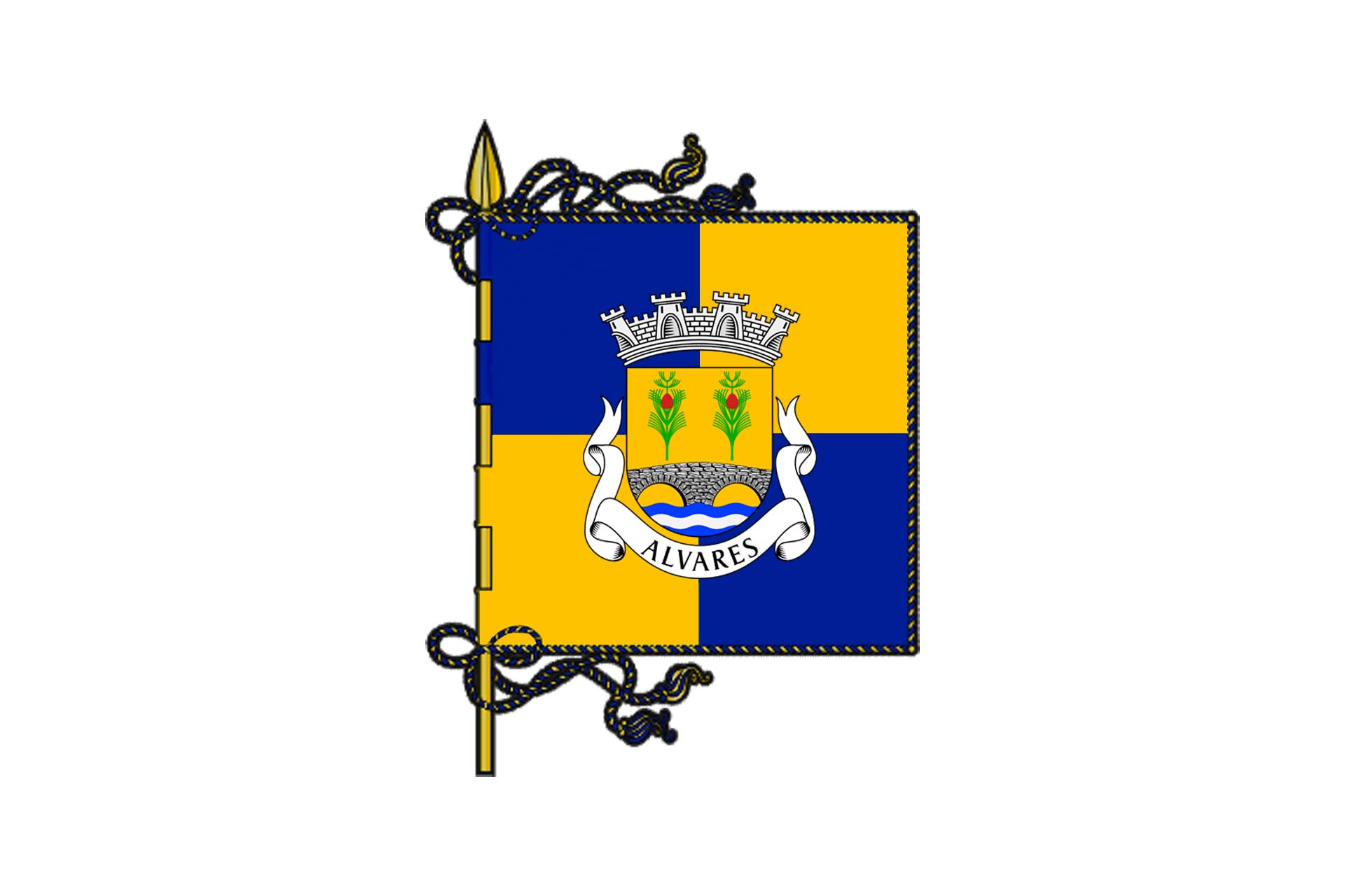 Esquartelada de azul e amarelo, cordões e borlas de ouro e azul.