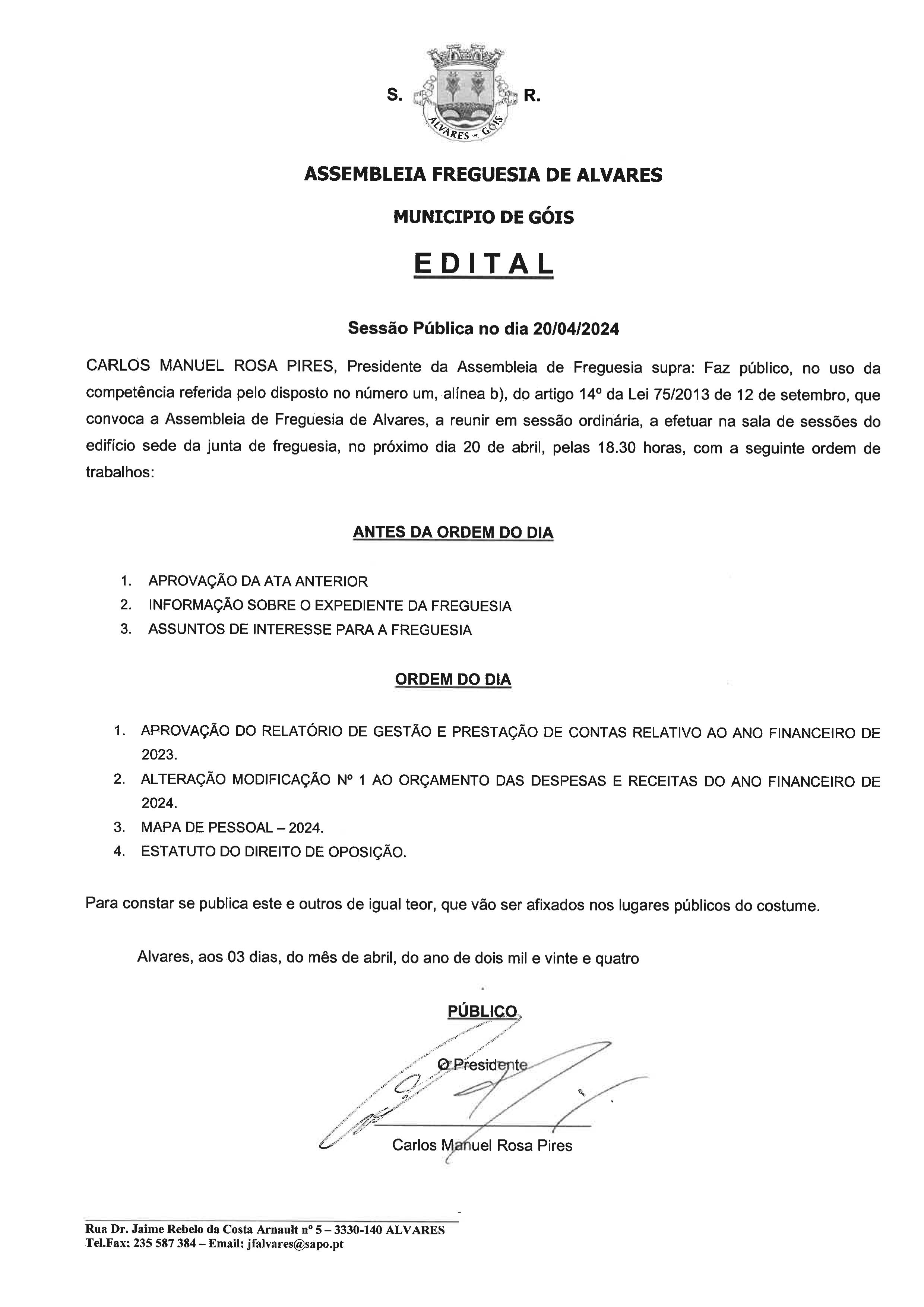 Edital assembleia freguesia de Alvares - Sessão pública - Dia 20-04-2024