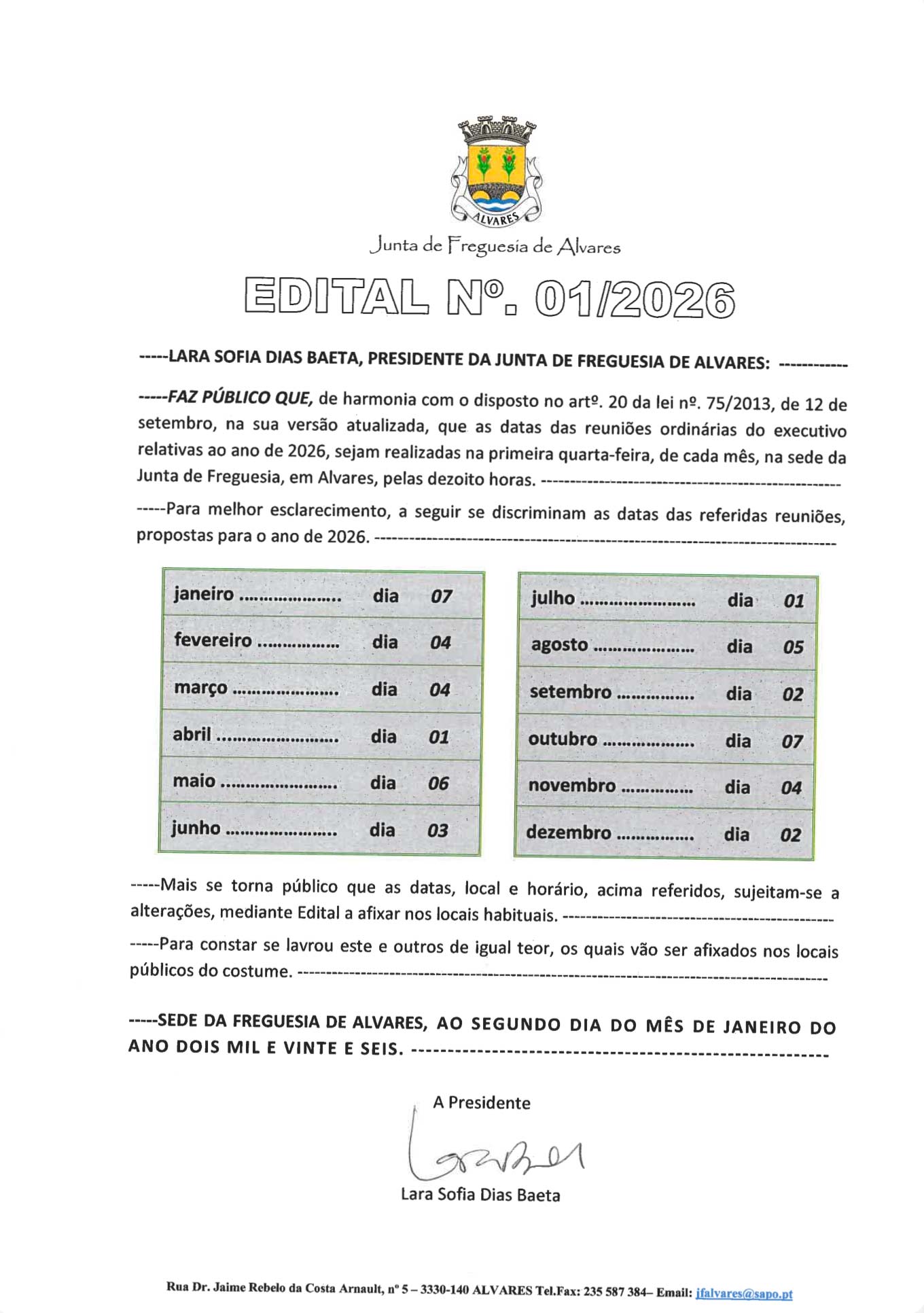 Edital n.º 1 de 2026 - Datas das reuniões ordinárias do executivo...