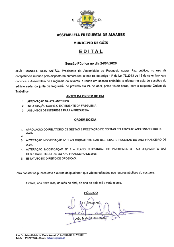 Edital assembleia freguesia de Alvares - Sessão pública - Dia 24-04-2026